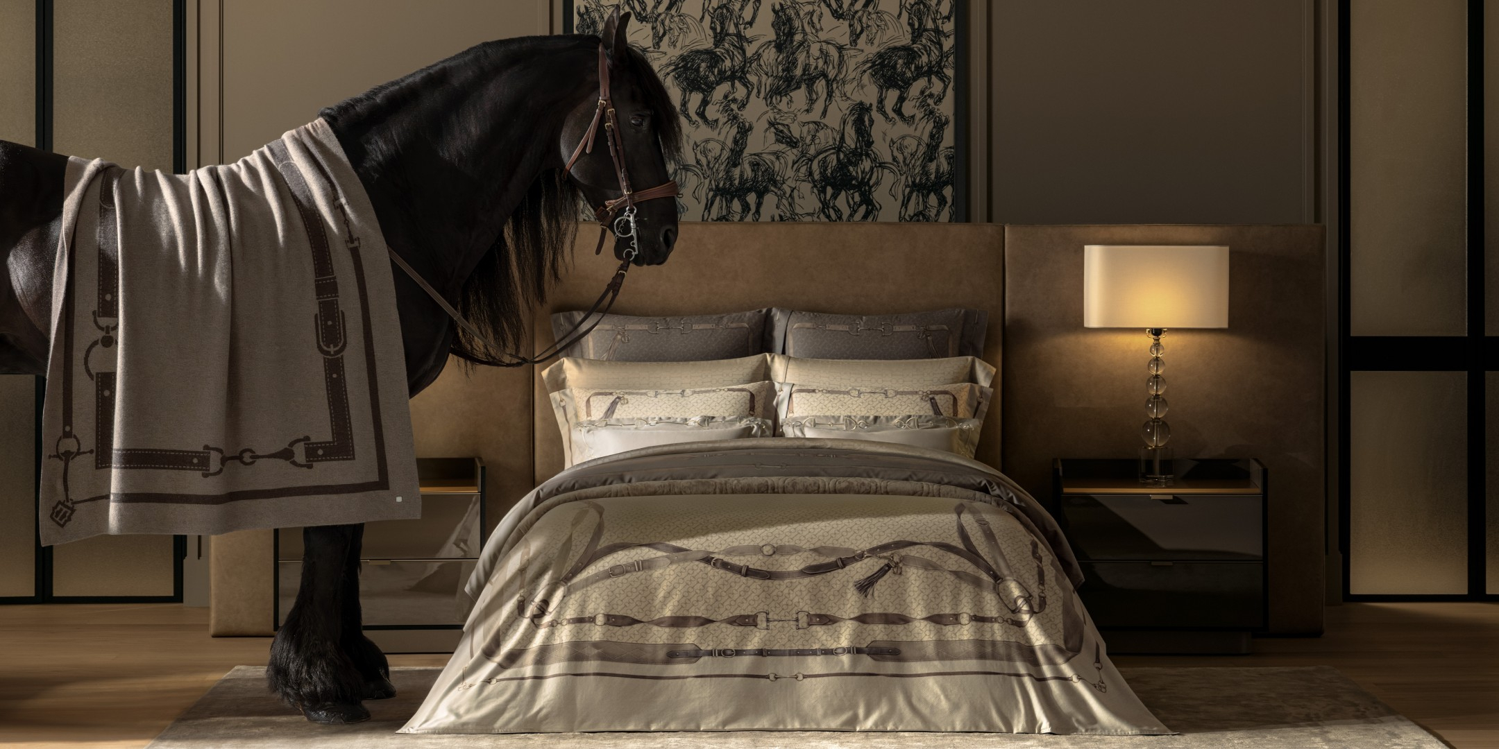 The collection is based on bed linen made in a classic style and muted shades of gray and brown. Beige, coffee, walnut, and warm gray are the colors of the horse's stirrups, saddle, and silky mane. The model is decorated with an elegant ornament, in which the details of horse ammunition are easily guessed, the texture and shine of the skin are accurately conveyed. An interesting feature of the design is the versatility of the drawing. It looks alive, voluminous, creates a sense of perspective and refraction of light.