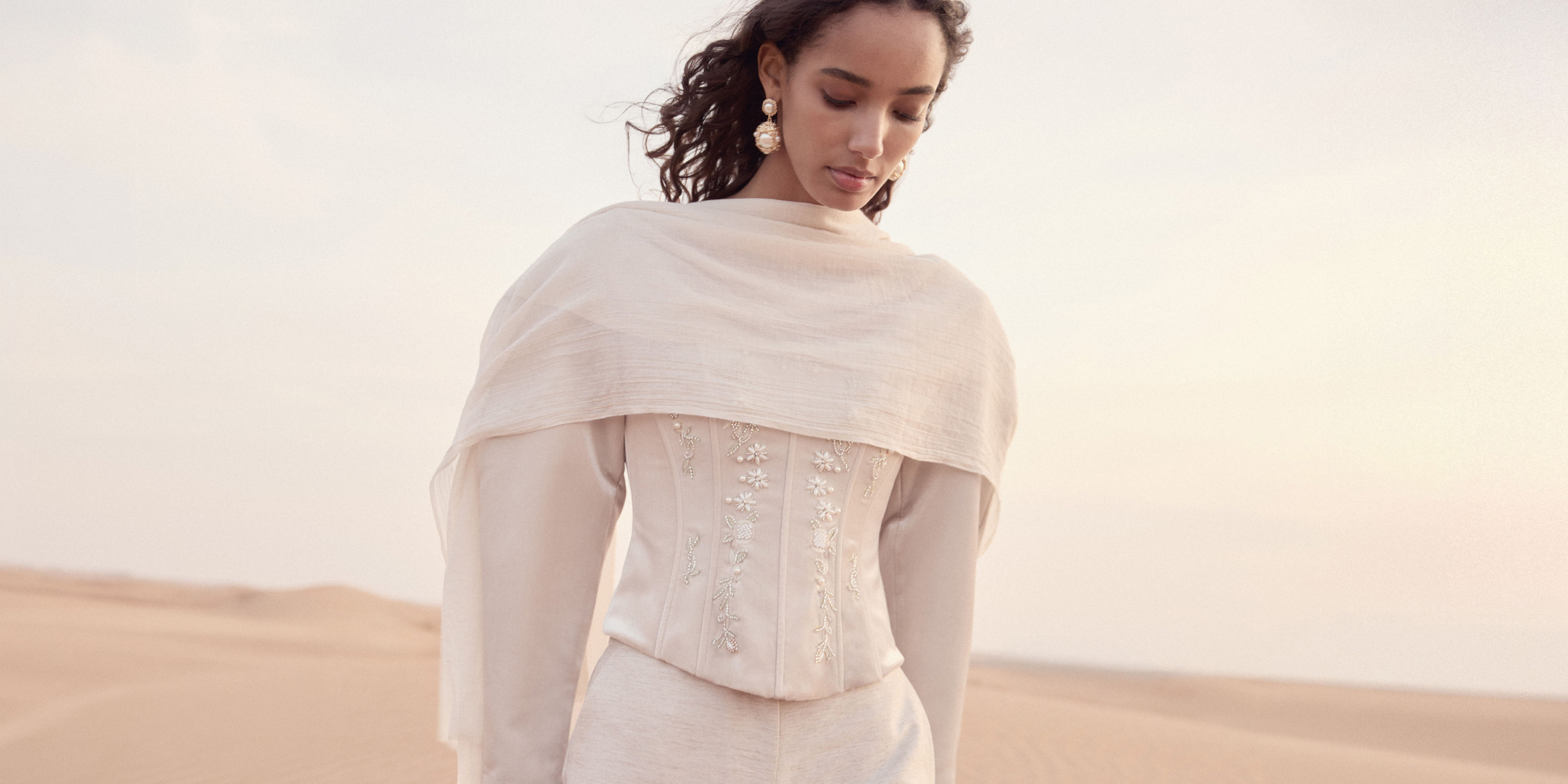 Образы завершают обувь и аксессуары: кожаные босоножки, мюли и сандалии, длинный полупрозрачный палантин, а также массивные золотистые серьги и браслет.