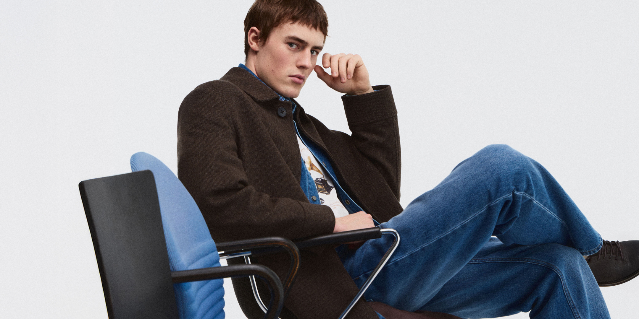 Для деловых сочетаний в коллекции представлены блейзер в «гусиную лапку», хлопковые рубашки и широкие брюки со стрелками. Среди изделий для городских прогулок — однобортное пальто из плотной смесовой шерсти, рубашка из денима, лонгслив из джерси, футболки с принтом, прямые джинсы и комплект в спортивном стиле с контрастной отделкой. Завершают капсулу изделия из замши и кожи: сумка-боулинг, ботинки на шнуровке или классические кеды.