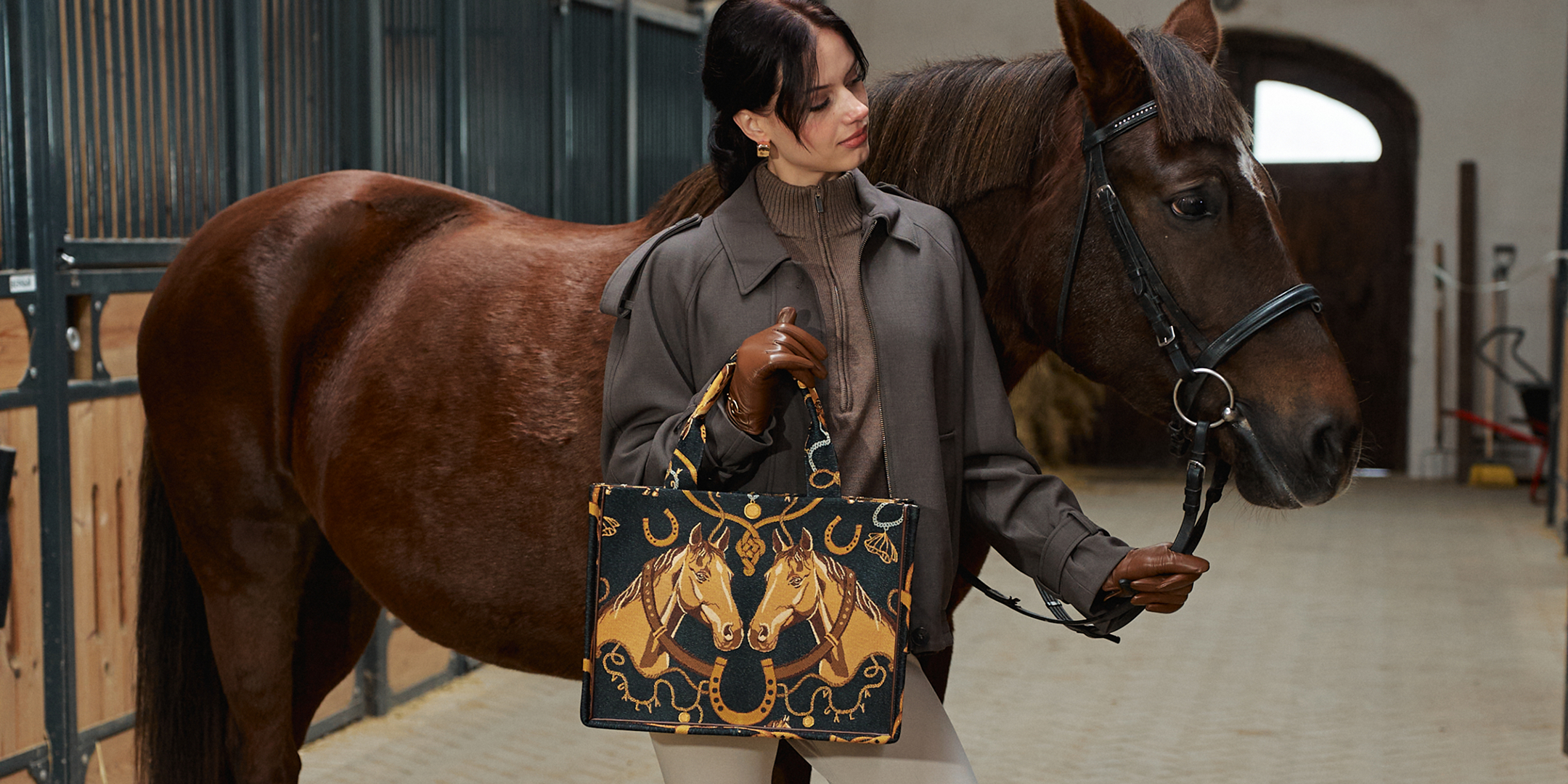 Принт создан художником бренда с главными символами года - грациозной лошадью и подковами на удачу, перенесен на сумки и аксессуары разных форматов. В новой коллекции представлены 2 варианта: «Лошади и подковы» и «Подковы и цепи».